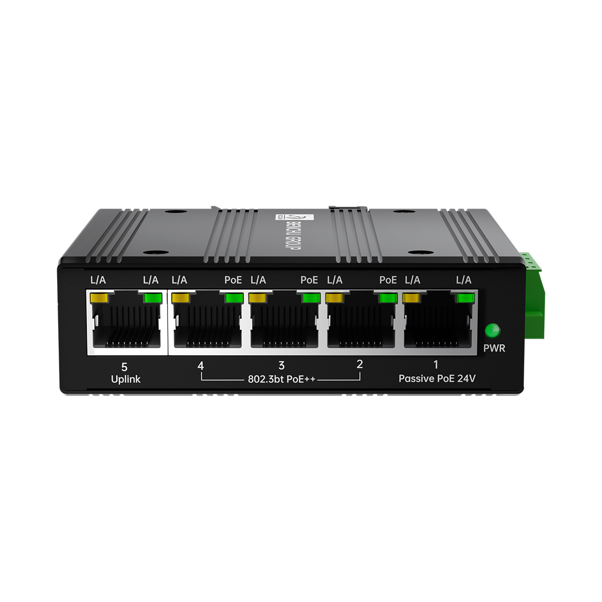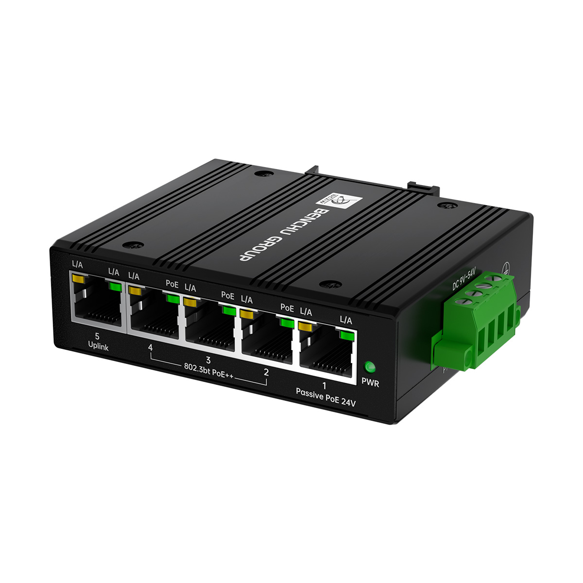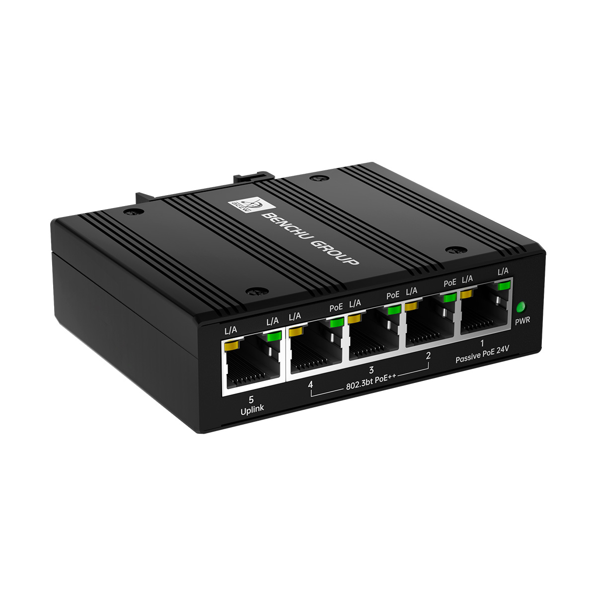 The Benchu group's IES7211-EX04G-90W is an industrial-grade 5-Port PoE Passthrough Switch designed to deploy networks where power outlets and distance are constraints. It receives data and up to 90W of power via a single 802.3bt PoE++ input cable, then delivers both to four downstream devices, providing 30W of 802.3at PoE+ per port to IP cameras, APs, and IoT gear.